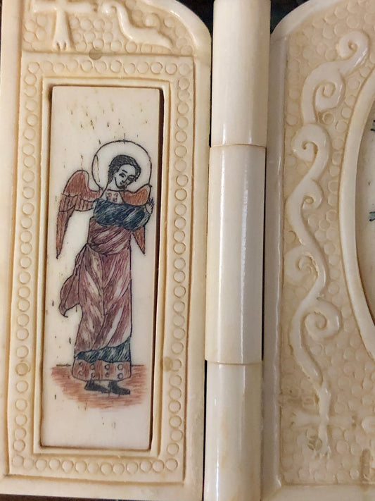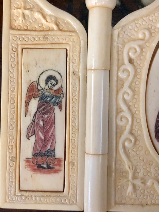 St. George killing a dragon, handmade icon painted and sculptured on Ivory. Late 19th Century.