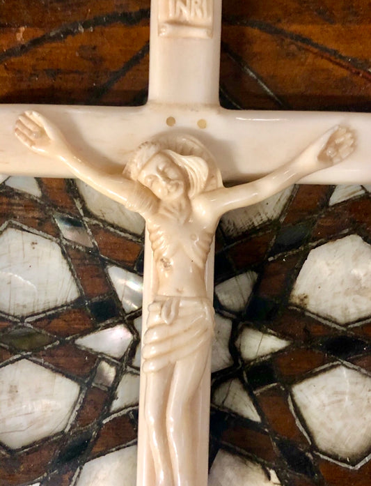 A handmade Jesus statue placed on the Cross, made of Ivory. Late 17th Century.
