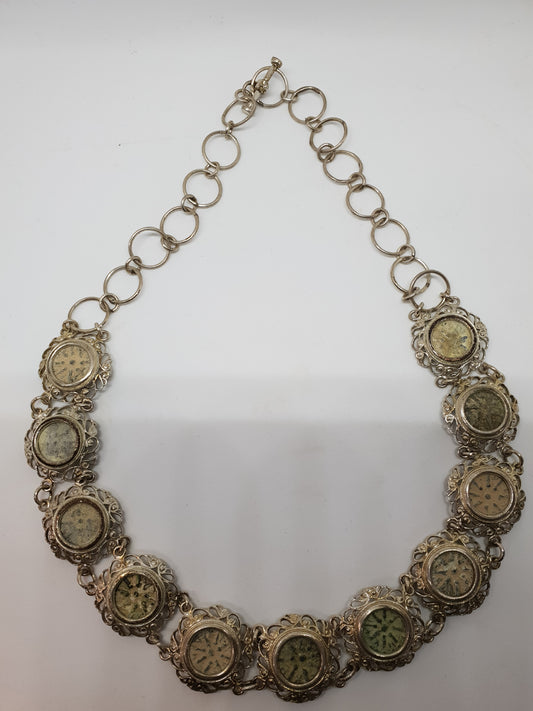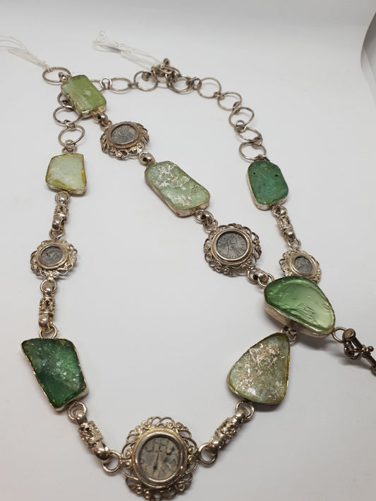 ANCIENT BIBLICAL COINS WITH ANCIENT ROMAN GLASS SET IN SILVER NECKLACE AND BRACELET