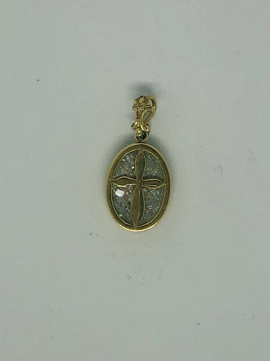 A Roman Glass Pendant with a golden Cross placed carefully on the glass, 14k.