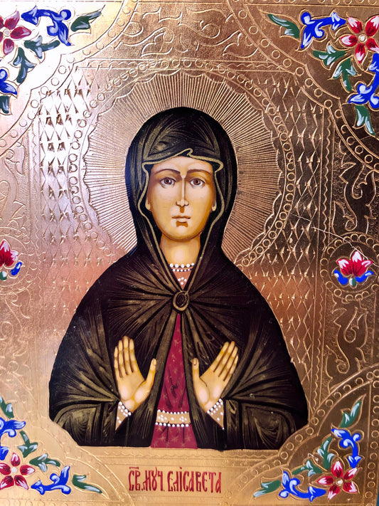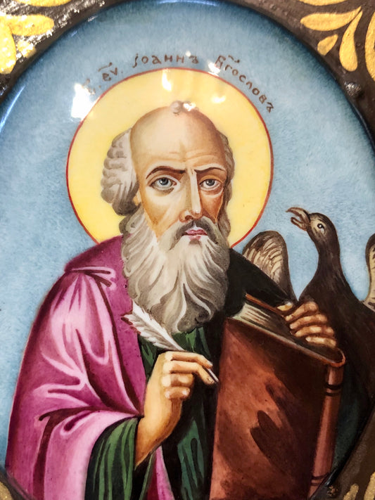 A Russian Enameled icon of St. John The Evangelist, wood carved.
