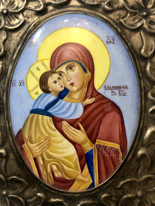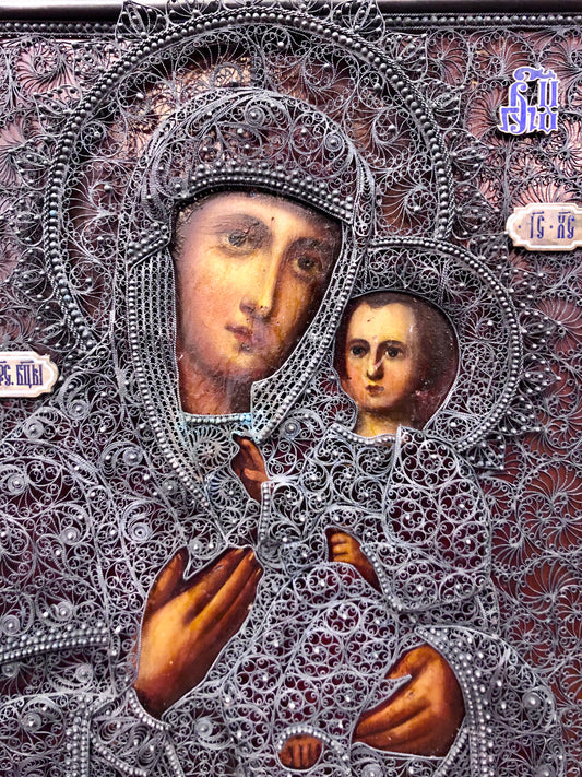 A Russian Enameled Silver Icon of Mother of God. 18 Century.