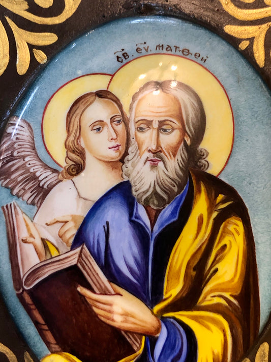 A Russian Enameled icon of St. Mathew The Evangelist, wood carved. 20th Century.
