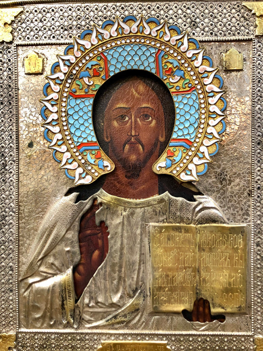 A Russian Enameled-Silver Stamped Pair of the Wedding icon of Jesus Christ and Mother of God 19th Century.
