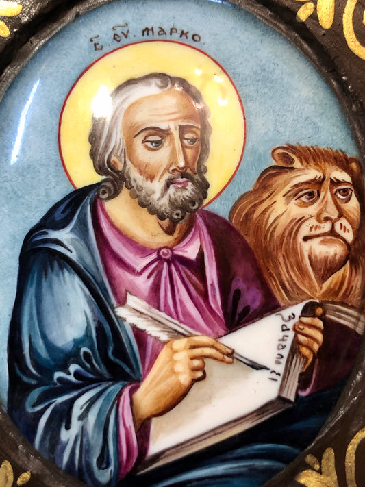 A Russian Enameled icon of St. Mark The Evangelist, wood carved.