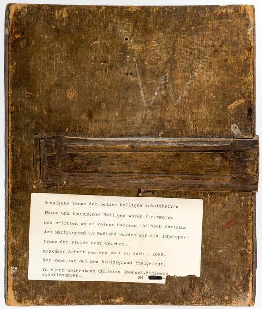 The Patron Saints of Horses Florus and Laurus, handmade Russian icon. 17th Century.